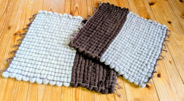 作者:ゆらりさん寸法:40cm × 48cm 40cm × 40cm素材:ウール たて糸 コットンフェルト紐マット羊毛スライバーを縮絨して、紐を作ってよこ糸に...