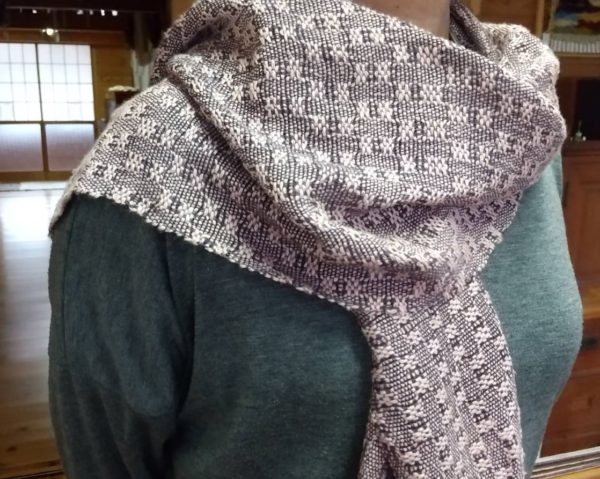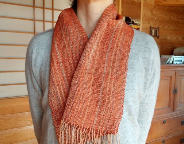 作者:Uさん寸法:32cm × 160cm素材:キャッシュウール、ラムウール8枚綜絖、8本踏木の織機で織られました。細いたて糸に少し太いよこ糸を使用。踏木を踏む順番を... -