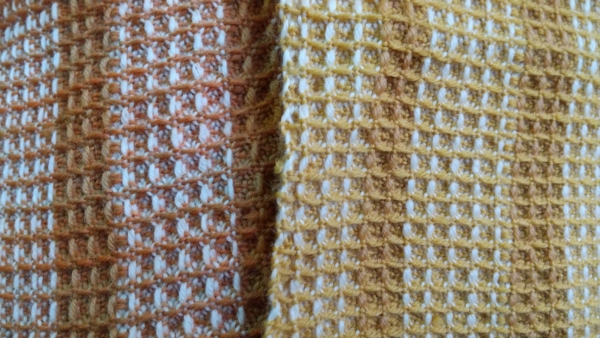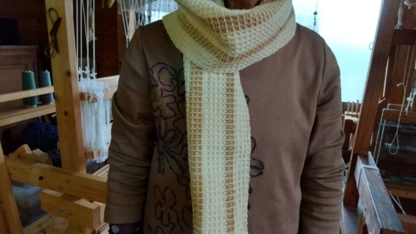 No.195 ワッフル織マフラー 2021 5/16 生徒さんの作品 作者:ばあちさん 寸法:19cm × 136cm 白系 19cm × 180cm 茶系 素材:ウール ウールの中細毛糸で、プレゼント用に製作 4枚綜絖でのワッフル織なので、小さいワッフルの模様が暖かそうで、しっかりと張りもある仕上がりになりました。 生徒さんの作品 よかったらシェアしてね! URL Copied! URL Copied! 高原選手の日々 ㉗ No.196 マフラー この記事を書いた人 kinone 関連記事 No.106 カシミアストール 2019.03.08 No.48 染色 2017.06.14 No.262 バッグ 2023.08.05 N0.325 マフラー 2025.01.12 No.41 No.42 カシミアマフラー 2017.04.21 No.272 ティーマット 2023.09.08 No.246 マフラー 2023.04.15 No.190 マフラー 2021.01.09