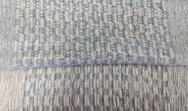 表も裏も糸目が飛びながら織れていきます。あまり打込まずに、糸目が綺麗にそろう様に気を付けながら、ふわりと織ります。しっかり縮絨して仕上げますと、表と裏どちらも違う表情を持つマフラーになります。