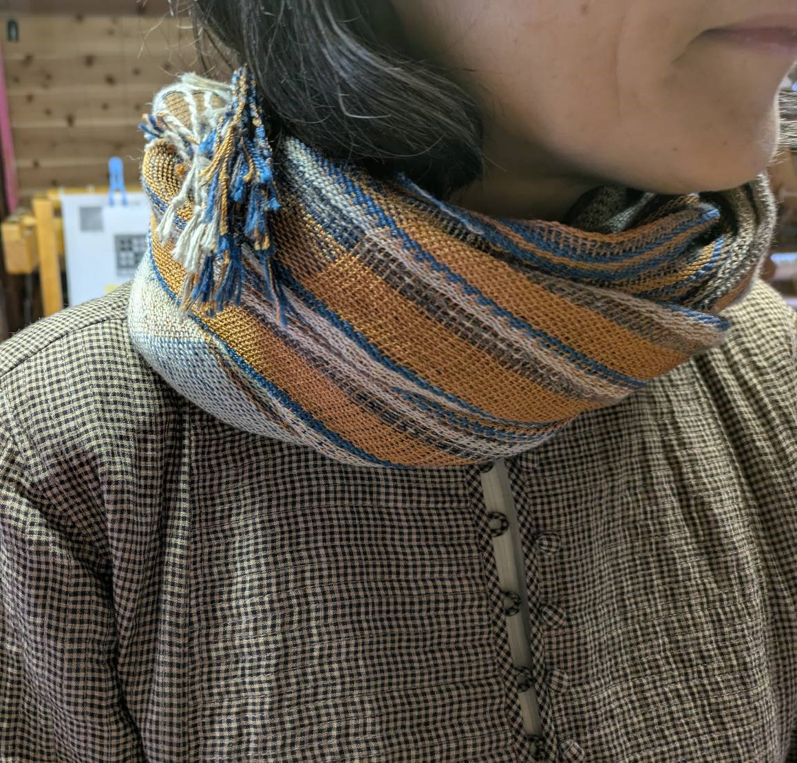 No.248 マフラー 2023 5/22 生徒さんの作品 作者:三山さん 寸法:26.5㎝ × 149㎝ 素材:プレミアムカシミア 一般的なカシミアより長い繊維のカシミア糸を使用。 平織とは思えない様な羽立ちで、手触りも最高に気持ちの良い作品です。 生徒さんの作品 よかったらシェアしてね! URL Copied! URL Copied! お参りの日 NO.249 スリースマット この記事を書いた人 kinone 関連記事 No.150 カシミアマフラー 2019.12.11 N0.325 マフラー 2025.01.12 No.355 ショール 2025.11.17 No.292 チューブ織マフラー 2024.03.14 No.47 布フェルトのロングベスト 2017.06.14 No.253 マフラー 2023.06.18 NO.251 マフラー 2023.05.22 No.66 破れ斜紋織マフラー 2018.01.05