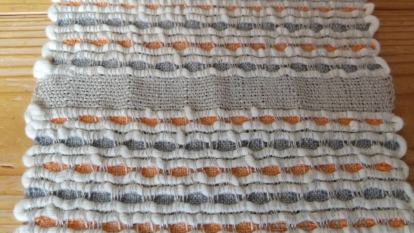 No.261 センター 2023 8/05 生徒さんの作品 作者:いのうえさん 寸法:18cm × 118cm 素材:たて糸:リネン よこ糸;コットン 蜂の巣織、4枚綜絖。 よこ糸の素材や色を、いろいろ試した後、センター様に織り始めます。 よこ糸の太さの差が大きいほど、きれいな蜂の巣模様になります。 生徒さんの作品 よかったらシェアしてね! URL Copied! URL Copied! No.260 ランチョンマット No.262 バッグ この記事を書いた人 kinone 関連記事 No.153 コースター 2020.01.24 No.265 テーブルセンター 2023.08.05 No.168 ブランケット 2020.04.09 No.346 シルクマフラー 2025.07.28 NO.219 オーガニックコットンマフラー 2022.05.09 No.334 テーブルランナー 2025.03.28 No.49 手拭い型抜き染 2017.06.14 No.298 マフラー 2024.04.15