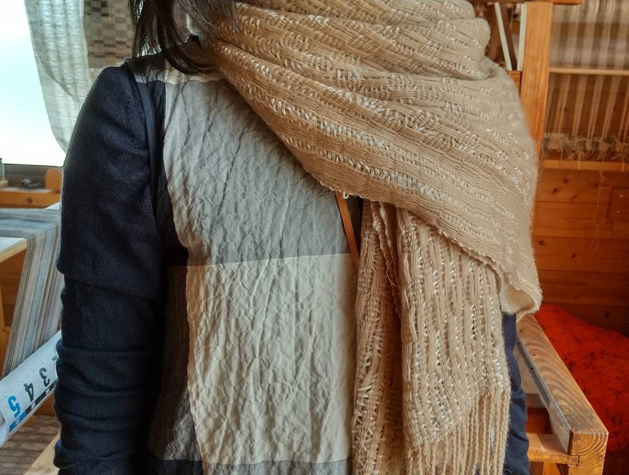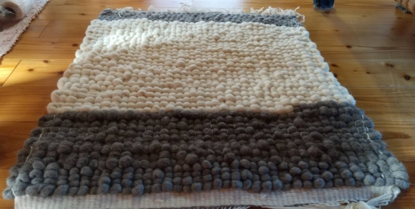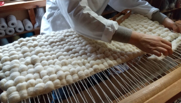 数種類の羊毛スライバーを紐状にフェルト化し、ウール糸のよこ糸と交互に少し引き出して、ゆるみを持たせながら入れて織っていく。