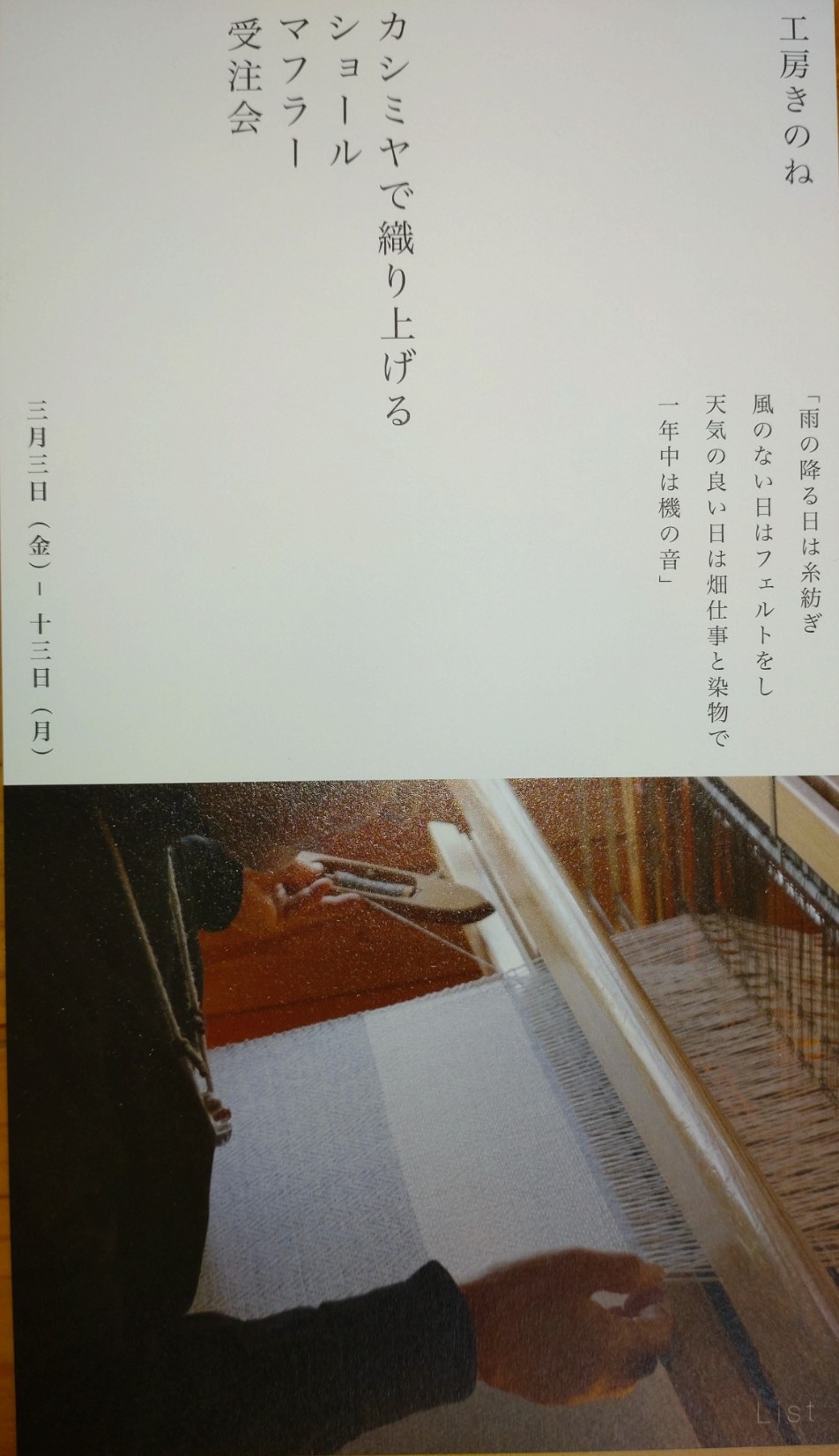 3月9日(土)は、バイヤス織りのワークショップもあります。(満席)