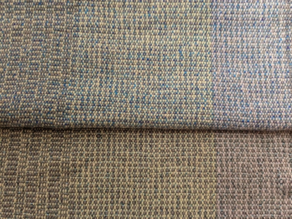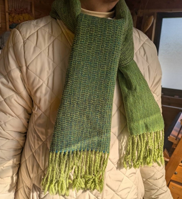 以前織られた、2色の糸の色糸効果のサンプル織の中から3種を選びたて糸にし、ウールのマフラーが仕上がりました。