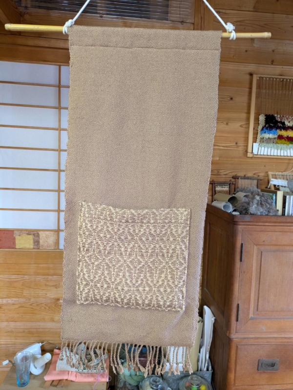 No.333 ウォールポケット 2025 3/28 生徒さんの作品 作者:Uさん 寸法:31cm × 70cm 素材:コットン オーバーショット織。 太いコットンの糸を使ってあります。 オーバーショット織のポケットの中に小さい花器を入れ、花を活けるのだそう。 素敵ですね。 生徒さんの作品 よかったらシェアしてね! URL Copied! URL Copied! No.332 オーバースカート No.334 テーブルランナー この記事を書いた人 kinone 関連記事 No.50 手拭い型抜き染 2017.06.16 No.255 マフラー 2023.06.18 No.274 のれん 2023.10.08 No.262 バッグ 2023.08.05 No.294 マフラー 2024.03.28 No.202 ウールマフラー 2021.07.18 No.14 布フェルトストール 2016.10.16 No.207 ブンデンローゼンゴンのミニマット 2021.11.06