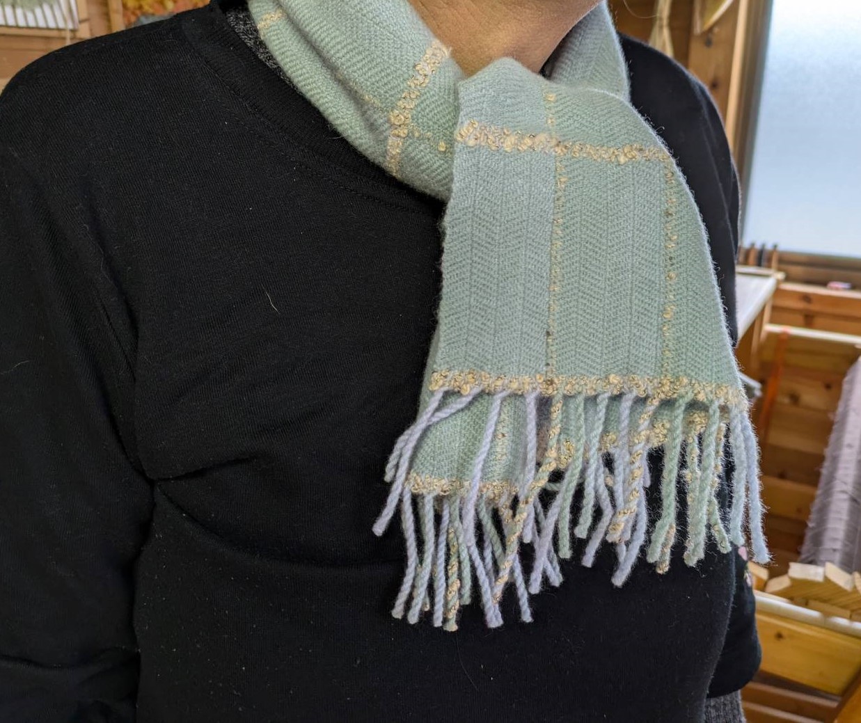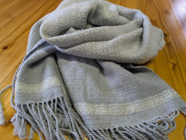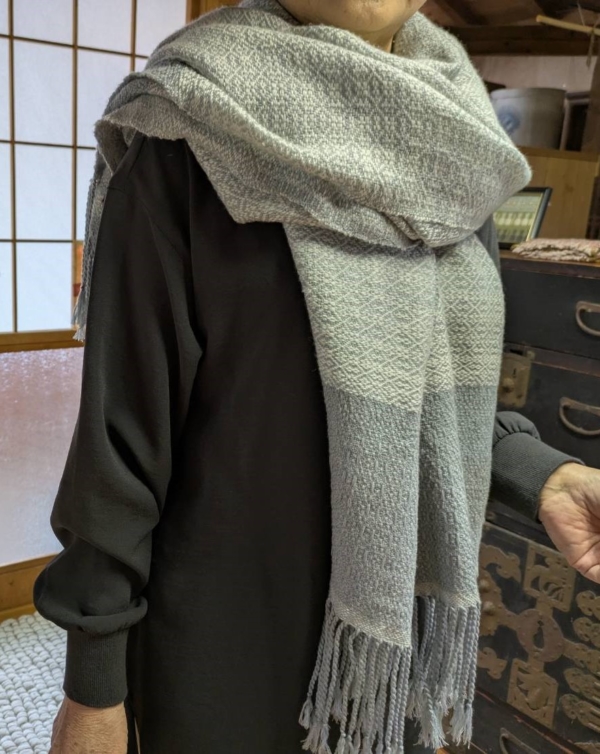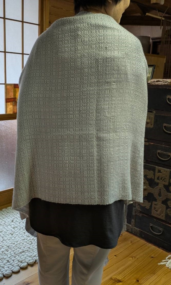 両端に穴を開けて織ってありますので、手を通して肩にかけると、車の運転や両手を使う時等も重宝しそうです。
