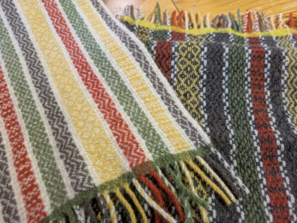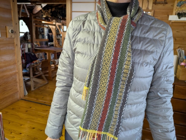 No.359 マフラー 2025 12/27 生徒さんの作品 作者:ニケさん 寸法:上 20㎝ × 126㎝ 下 21.5㎝ × 130㎝ 素材:ラムウール 斜紋織りのバリエーション。 同じたて糸ですが、よこ糸を変えて雰囲気の違うマフラーに仕上がりました。 とても丁寧に織られました。色合いが楽しい作品です。 生徒さんの作品 よかったらシェアしてね! URL Copied! URL Copied! No.358 ストール No.360 ストール この記事を書いた人 kinone 関連記事 No. 101 カシミアマフラー 2018.12.05 No.76 手紡ぎマフラー 2018.03.21 No.332 オーバースカート 2025.03.27 No.8 手紡ぎマフラー 2016.10.08 No.25 シャギーマット 2016.12.08 No.258 ストール 2023.06.25 No.324 マフラー 2024.12.29 No.196 マフラー 2021.05.16