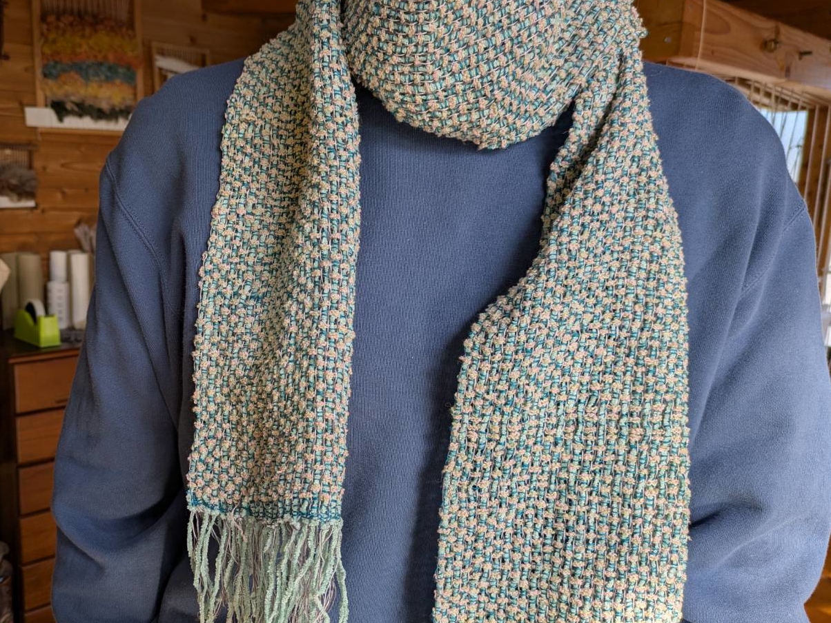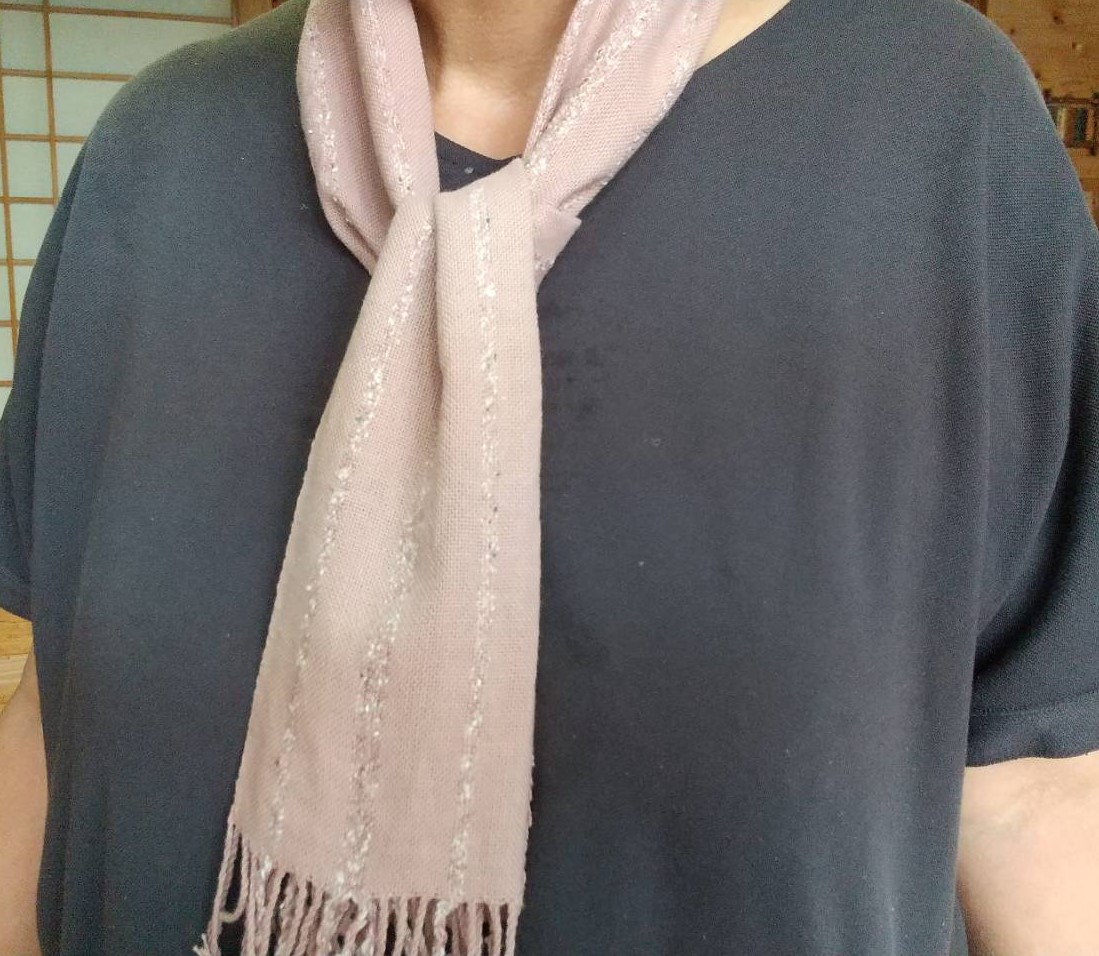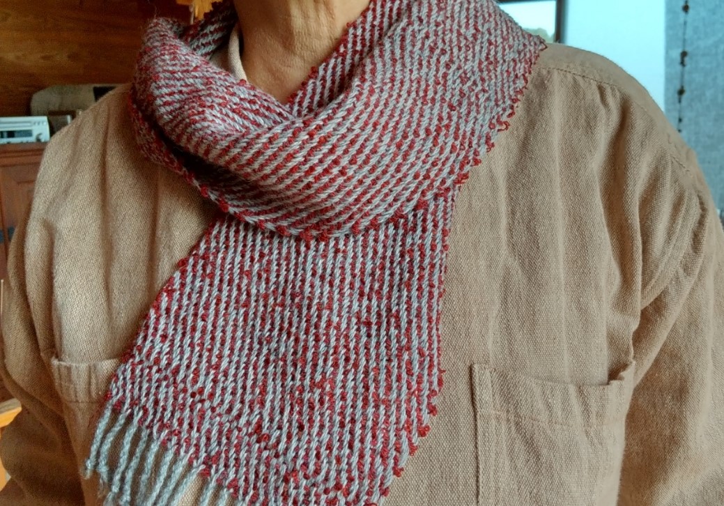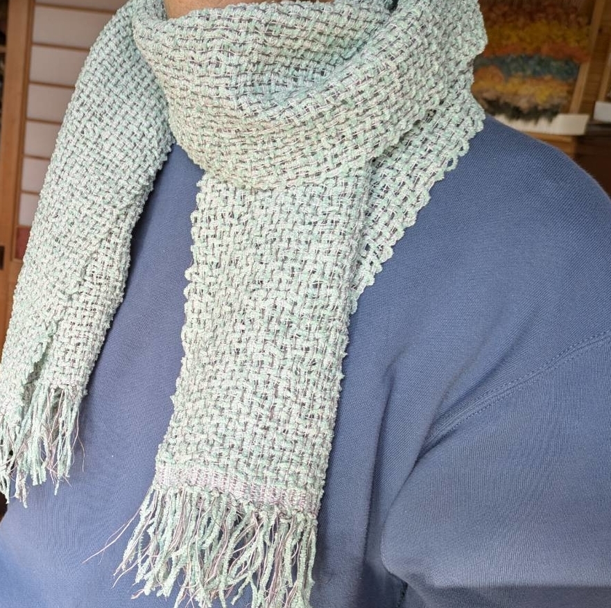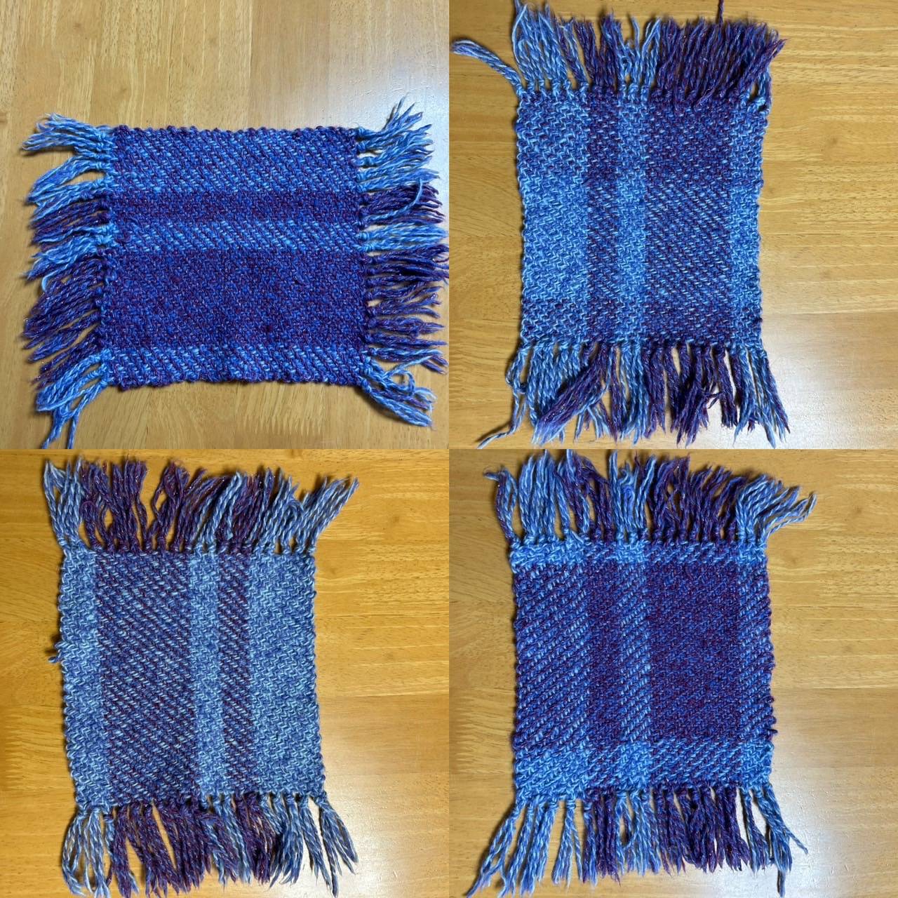 2本ともたて糸は同じですが、よこ糸に使ったモール糸を変えたり細い糸の色を変えたりして、違いを出してあります。